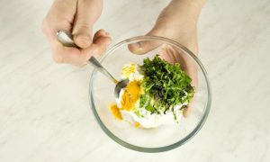 - Vmiešajte tvaroh, nasekané bylinky a kurkumu homogénna hmotnosť.