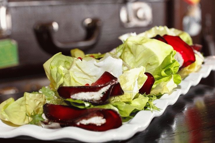 - Vložte kešu syr na plátky červenej repy. opatrne zabaliť to.