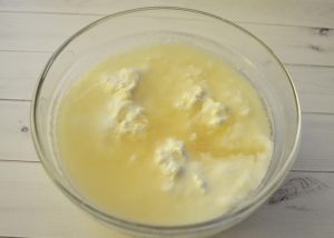 - Pri plnení miešajte tvaroh a jogurt, med a vanilín. pridanie zriedená želatína.