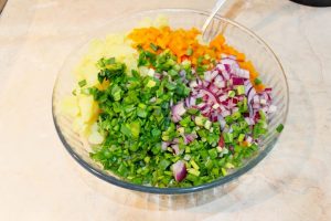 - Červená a zelená cibuľa sa nakrája na malé kocky. Pridať do mrkva a zemiaky.
