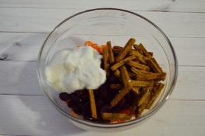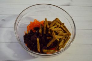 - V hlbokej miske zmiešajte mrkvu, sušienky a fazuľu.