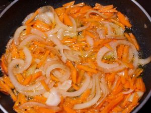 - Kocky s mrkvou a cibuľou, smažte na panvici s cesnak a korenie v olivovom oleji.