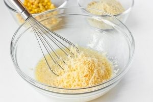 - Nalejte kefír, pridajte strúhaný syr a dobre premiešajte.