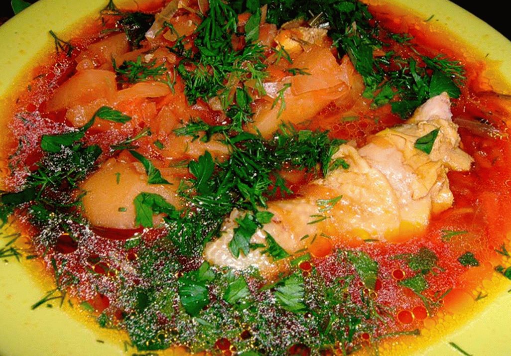 Boršč vyrobený z kuracích stehien. Rýchly, bohatý a chutné.