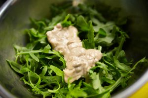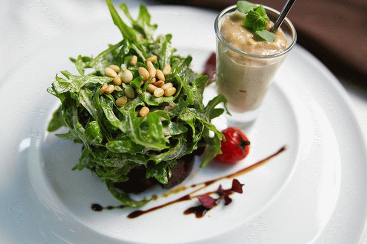 - Pomocou pečiaceho krúžku roztiahnite pečeň. Rukola pridáme trochu omáčky a premiešame.