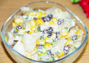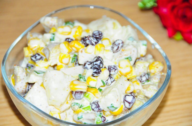 V miske so smaženými kúskami kurčaťa pridajte pripravené hrozienka, ananás, zelená cibuľa, kukurica, majonéza, dobre premiešame a vyskúšajte soľ.