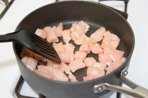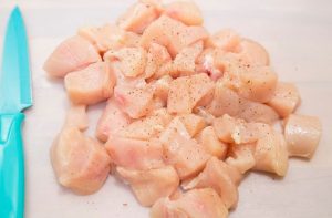 Odpojte filé z kuracieho prsníka ostrým nožom z kostí, vyberte ho kožu nakrájanú na kocky, posypeme soľou a mletým korením.