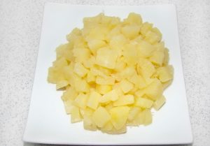 Roztriedime hrozienka, starostlivo opláchneme a hodíme do cedníka. Otvorte konzervovaný ananás, vypustite a nakrájajte na malé kúsky, zelená cibuľa – jemne.