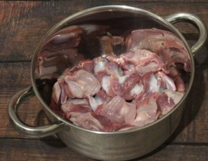 - Kuracie žalúdky sú dobre umyté, očistené od fólií. Vyplňte voda, pridajte soľ a varte asi hodinu. Ochlaďte pripravené žalúdky a nakrájame na kúsky.