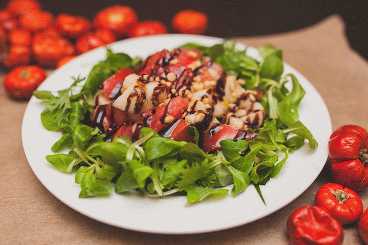 - Vložte šalátovú zmes na servírovacie taniere na vrch dajte hrušku a paradajky. Hotový šalát ozdobíme listami čerstvá bazalka, posypaná píniovými orieškami, sezóna toaletný balzamový krém.