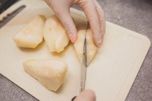 - Umyte si hrušky, olúpajte semená a šupky, každú hrušku nakrájajte na 8 častí a potom nakrájame na kocky.
