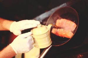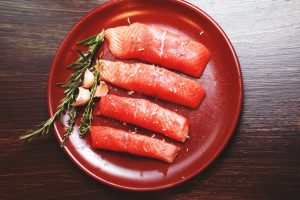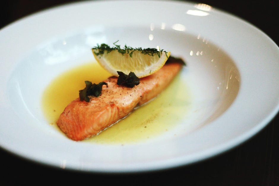 - Posypeme filé z lososa nasekaným cesnakom a dochutíme korením a soľ.