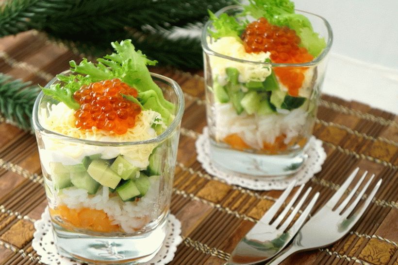 - Posypeme strúhaným syrom na vrchu, ozdobíme listom šalátu alebo greeny a červený kaviár. Šalát je pripravený, môžete slúžiť!