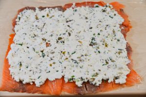 Tenké plátky lososa rozotrite na plastový obal v jednej vrstve a jemne rozložte tvarohovú zmes na vrch.
