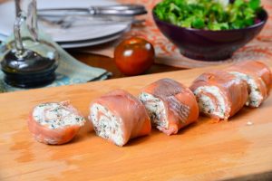 Losos s náplňou premeníme na rolku pomocou lepiacej fólie, zabalte do fólie a nechajte vychladnúť najmenej 2 hodiny. Lososová rolka vyberte, nakrájajte na 5 kusov a podávajte na jednej doske alebo na jednej platni porciované so šalátom z paradajok a šalátom (mix).