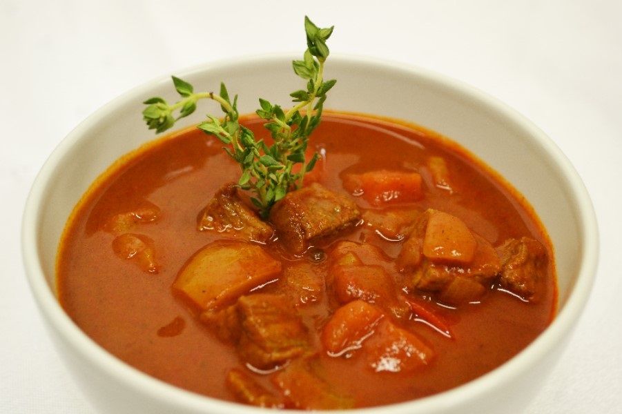 Lahodná gulášová polievka z hovädzieho mäsa a srdca. maďarský jedlo, ktoré sa dá variť doma!
