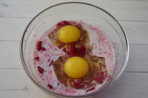 - Rozdrvte maliny do stavu pyré, pridajte vajíčko s mliekom.