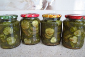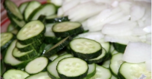 - Uhorky nakrájame na kruhy a cibuľu nasekáme na pol krúžky