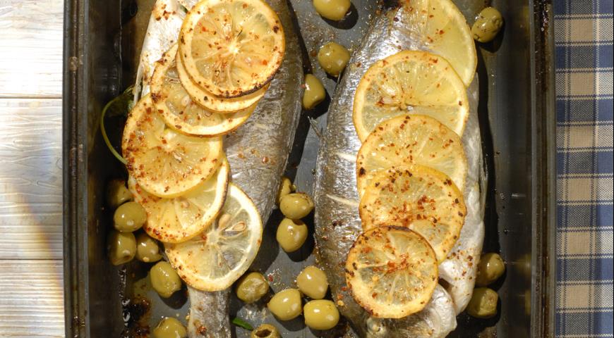 - Na ryby urobte niekoľko malých rezov a dajte ich do tvaru na pečenie. Rybu nalejeme marinádou. Položte citrón hore, okolo rybie olivy.