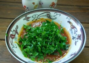 - Brúsený kôpor a petržlen pridajte do omáčky. plátok bazalka, pridajte aj do omáčky.