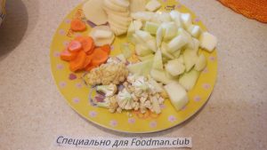 - Dôkladne opláchnite. Karfiol odrezal nohy, mrkvu šupky, nakrájané na kruhy, tiež vyrábajú zemiaky. v cuketa jadro, nakrájané na plátky.