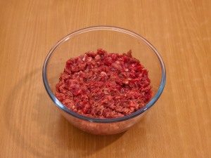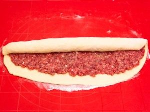 - Usadené cesto rozvaľkajte valčekom na tenkú vrstvu. Vyložiť nesto rovnomernú vrstvu mletého mäsa a hodte ju.