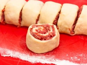 - Kotúľ nakrájajte ostrým nožom, so šírkou troch cm, vyčlenených na pätnásť minút.