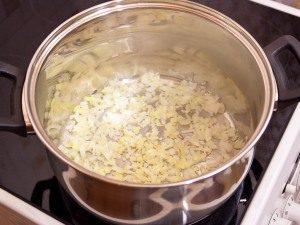 - V hlbokej, širokej panvici na predhriatom rastlinnom oleji poter nakrájanú cibuľu.
