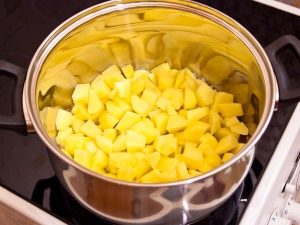 - Pridajte ošúpané hrubo nakrájané zemiaky, nalejte vodu, zakryte zemiaky, strúhadlo, mierne soľ, korenie.