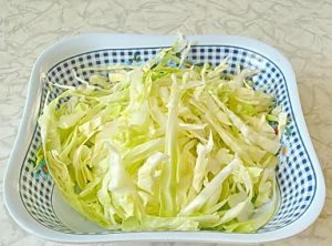 - Rezaná kapusta v tenkých prúžkoch v miske, soľ, mnem ruky. Šťava by mala vyniknúť.