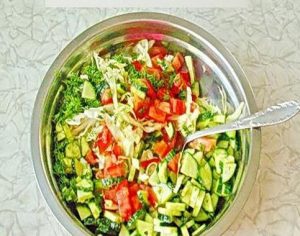 - Vypustite kapustovú šťavu, pridajte uhorky, paradajky, kôprom a bazalka, soľ. Pridajte trochu nerafinovanú slnečnicu maslo a nasekaný cesnak.