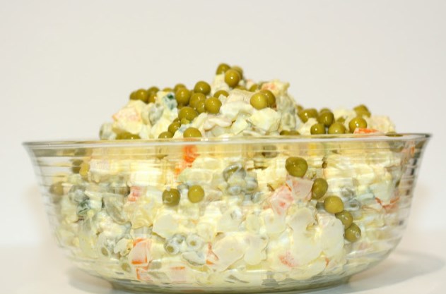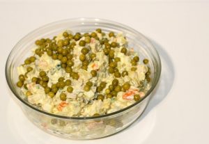 Do hotového šalátu, majonézy, posielame kyslou smotanou premiešajte, preneste do šalátovej misky, posypte konzervami hrášok a slúži na slávnostnom stole.