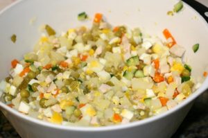 Spracované kuracie vajcia, zemiaky, mrkva, kuracie prsia, nakrájajte čerstvé a nakladané uhorky na kocky, cibuľu – jemne. všetko vložte do misky, pridajte hrášok (trochu nechajte dekorácie) a premiešajte.