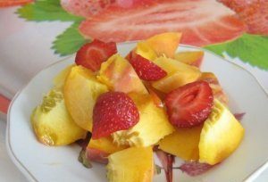 - Nezabudnite umyť ovocie a jahody. Ošúpajte hrušku a vyberte jadro. Všetko ovocie nakrájame na plátky.