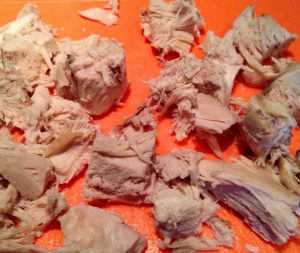 - Vytiahnite kurča, mäso oddeľte od kostí a rozoberte kusov.