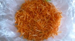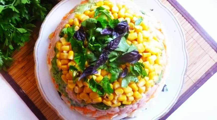 - Prikryte veľkú hlbokú šalátovú misku filmom. Na dno šalátové misky šíria kukuricu, zarovnané v jednej vrstve. po šíriť polovicu nasekaných listov šalátu, potom kreviet. Zalejte zálievku. Ďalej roztiahnite strúhanú mrkvu.