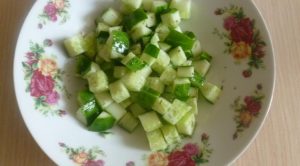 - Nakrájajte uhorky na kocky. Zmiešajte v miske s korením, soľou, ocot a kôpor.