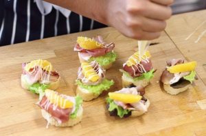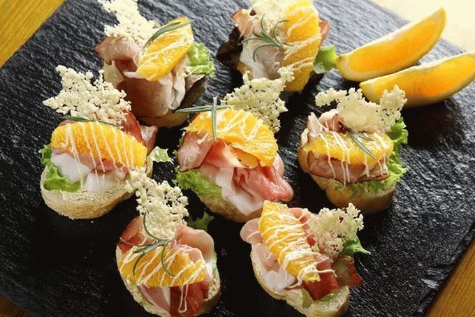 Listy šalátu položte na bagetu s olejom, pridajte navrch valcované plátky šunky. Rozdeľte pomaranč na plátky, bez šupky, pošlite na parmskú šunku a zalejte majonézou pomocou plastového vrecka, v ktorého rohu robíme malú rezať.