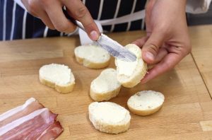 Bagetu nakrájajte na tenké plátky a namažte olejom. Parma šunku nakrájajte na malé kúsky.