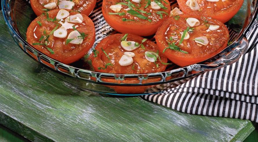 - Predhrejte rúru na 160 stupňov. Dajte paradajky do tvaru na pečenie posypeme cukrom a cesnakom, pokvapkáme olejom a ocot a pečieme jednu hodinu.