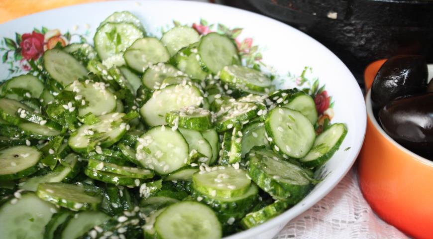- Šalát zmiešame, ochutíme olejom a soľou. posypať sezamové semienka, sezamové semienko možno vopred vyprážať do sucha v panvici.
