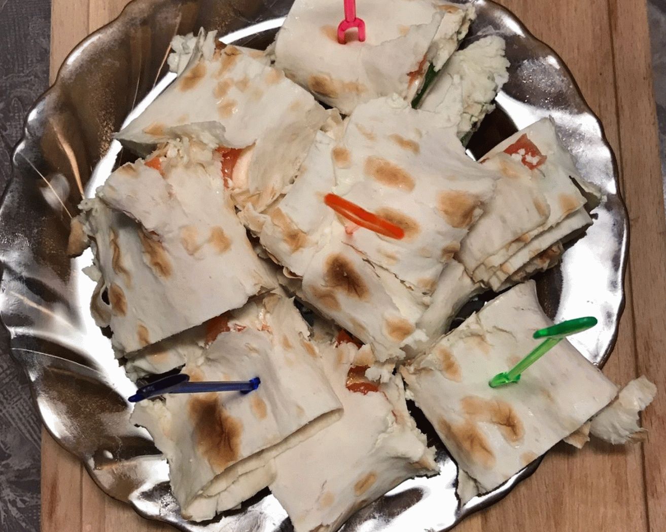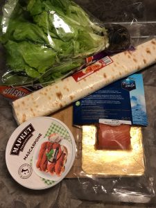 - Pita chlieb pita so surovým mascarpone. Listy šalátu opláchnite, potriasť vodou, položiť na vrchol, tiež nakrájať a položiť ryby. Roll pita chlieb do role. Cut. Môžete sa okamžite prihlásiť stôl.