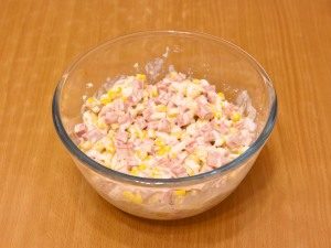 - V odmernej miske zmiešajte nakrájanú klobásu, vajcia a konzervovaná kukurica (vypustite tekutinu), soľ trochu.