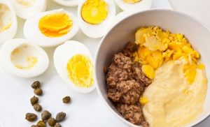 Lahodné kuracie vajcia plnené tuniakom, žĺtkami a majonézou Môžete si doma variť ako desiatu na slávnostný stôl. Ozdobte vajcia kaparami a kôprom.