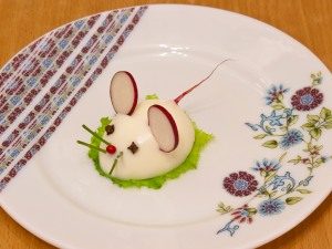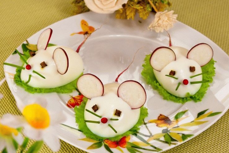 - My tvoríme myš, robíme oči z klinčekov. Vložte do rezov uši reďkovky (uhorka, mrkva). Urobme z červeného korenia nos opravte kvapku kyslej smotany. Anténa – z vetiev kopru. Zadržanie skutočný chvost repy alebo reďkovky.