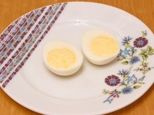 - Vajcia natvrdo uvarené na polovicu, žĺtky nasekajte v miske.