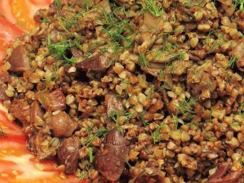 - Nalejte premyté a umyté pohánky do panvice. pridať vyprážanie s drobmi, korenie a bobkový list, krémové olej, zmiešajte.