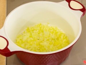 - V malej panvici (4 litre) olej, opečte cibuľu, nakrájanú na malé kúsky.