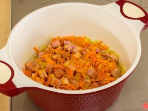 - Pridajte údené mäso, jemne nasekané na malé kocky hýbať smažiť.