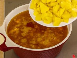 - Do vareného vývaru s mäsom dajte nakrájané zemiaky kocky alebo kocky. Varte ďalších 15 minút.